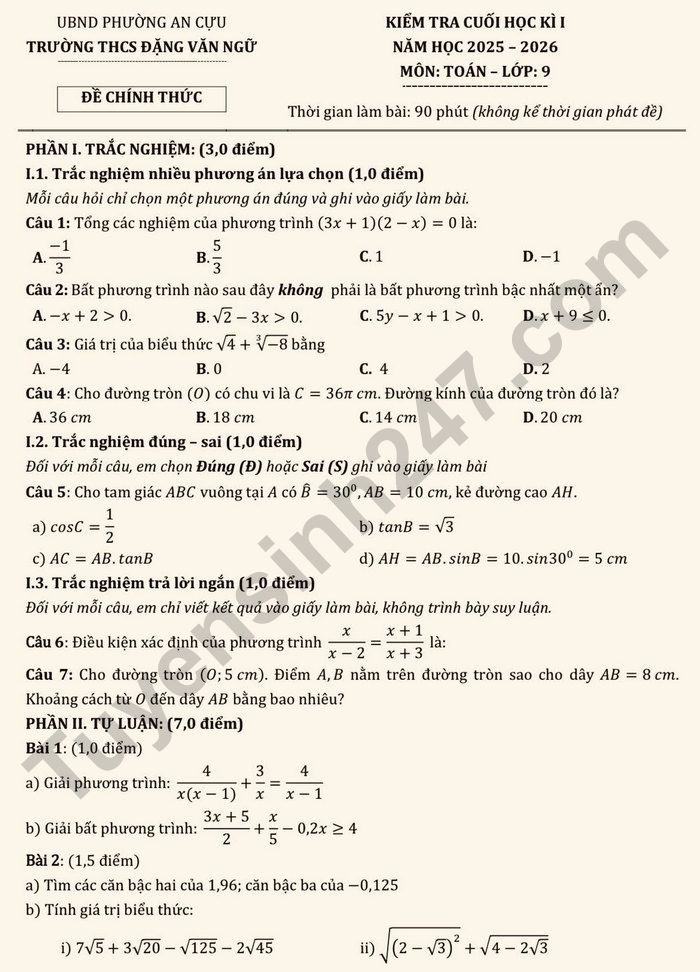 Đề thi học kì 1 môn Toán lớp 9 THCS Đặng Văn Ngữ 2025