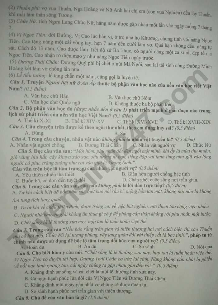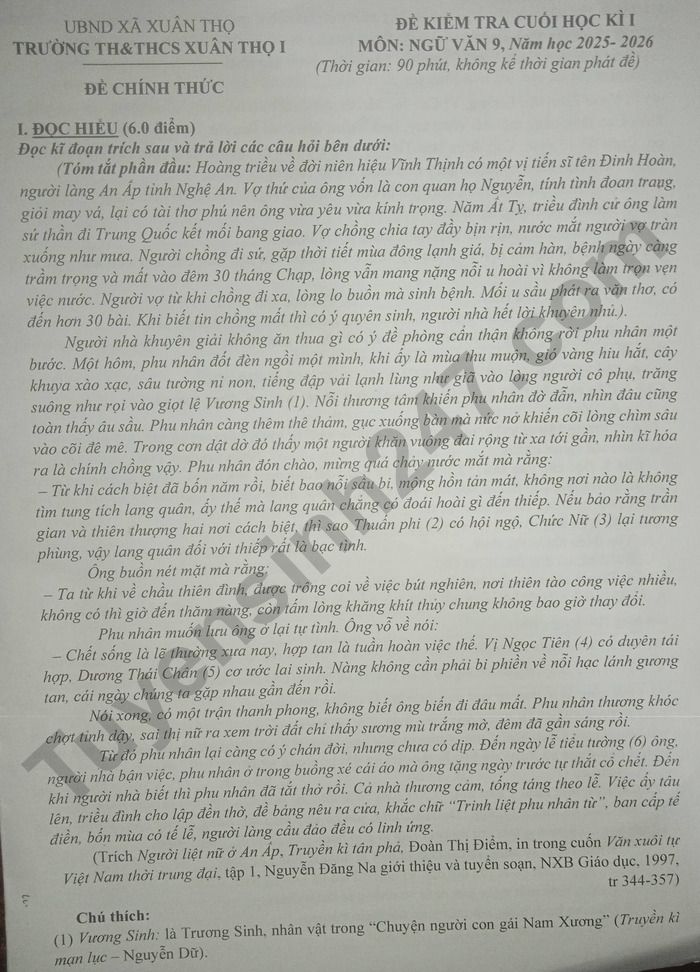 Đề thi học kì 1 môn Văn 9 TH&THCS Xuân Thọ 1 năm 2025