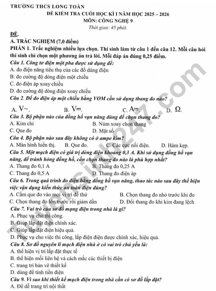 Đề thi học kì 1 năm 2025 Công nghệ 9 - THCS Long Toàn