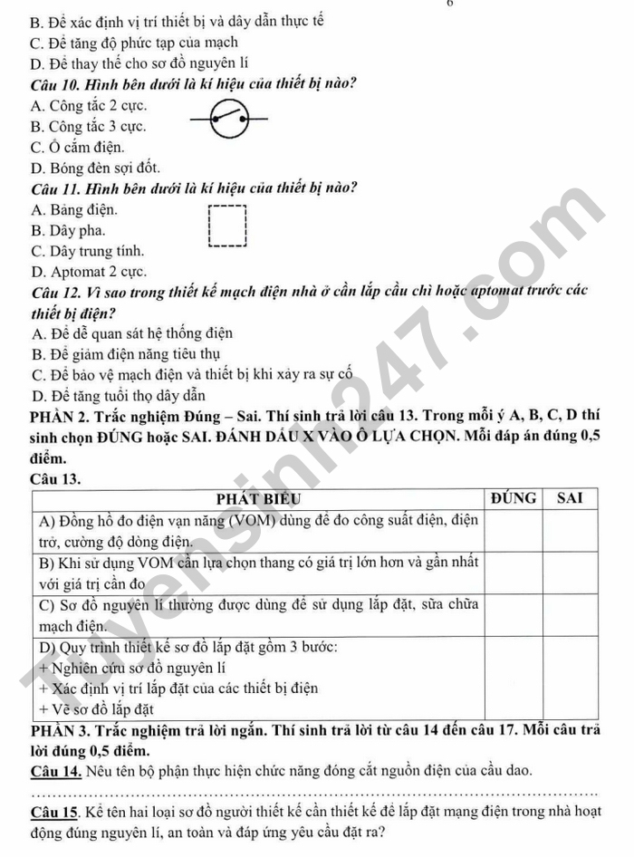 Câu 20. Vẽ sơ đồ nguyên lý cho mạng điện chiếu sáng cho phòng ngủ có chức năng bảo vệ quá tải, ngắn mạch, gồm một đèn được điều khiển ở hai nơi, ổ cắm điện cấp điện cho thiết bị điện di động.