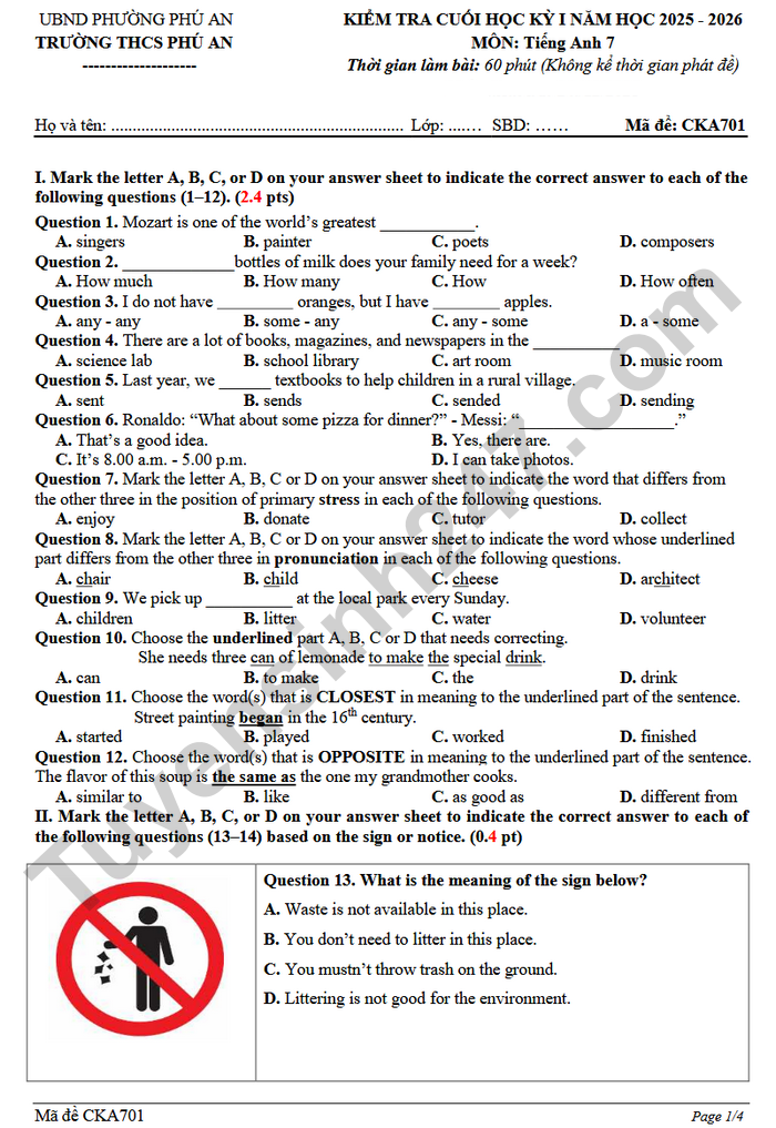 Đề thi học kì 1 năm 2025 môn Anh 7 THCS Phú An