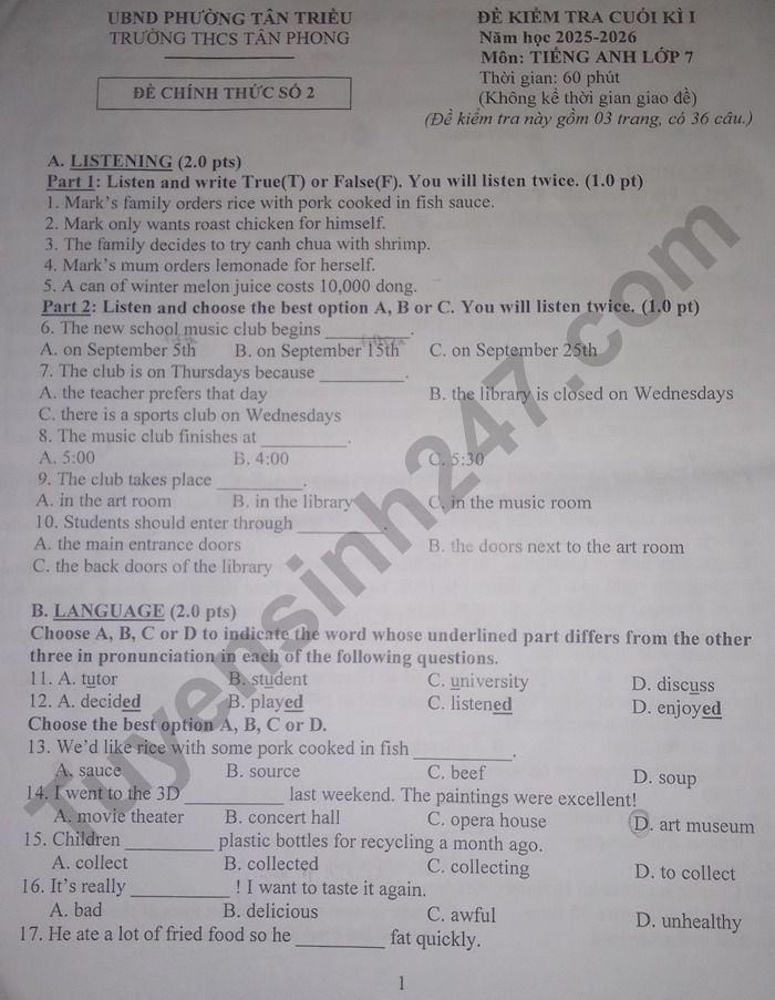 Đề thi học kì 1 năm 2025 THCS Tân Phong - lớp 7 môn Anh