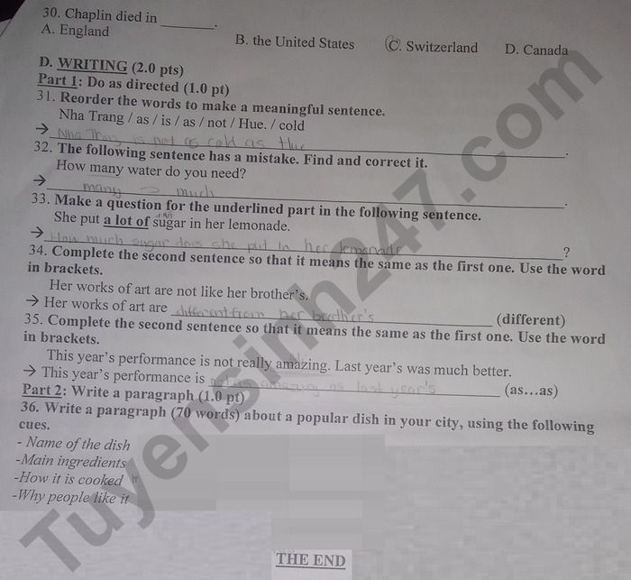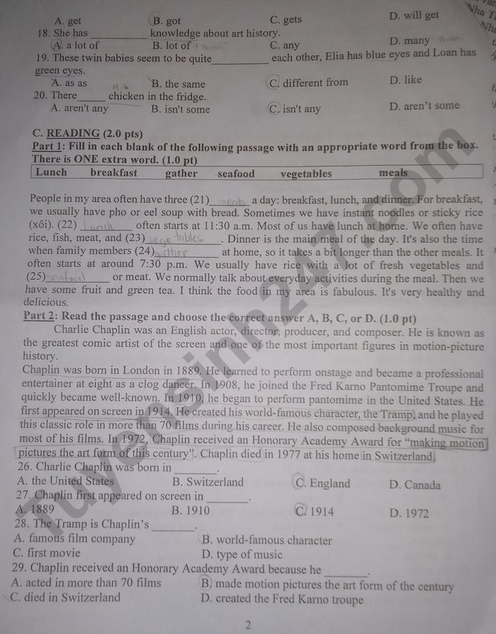 Lưu ý: Đáp án trong đề là bài làm của học sinh, có thể không chính xác