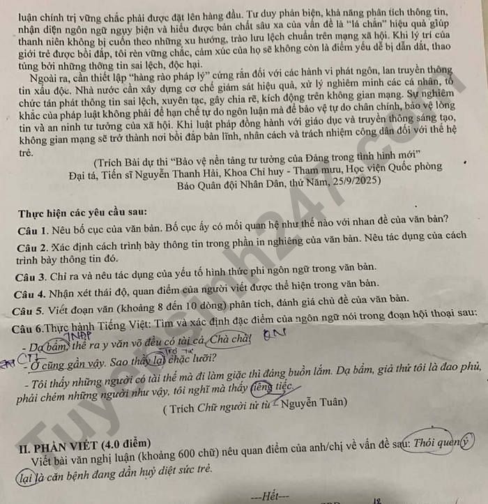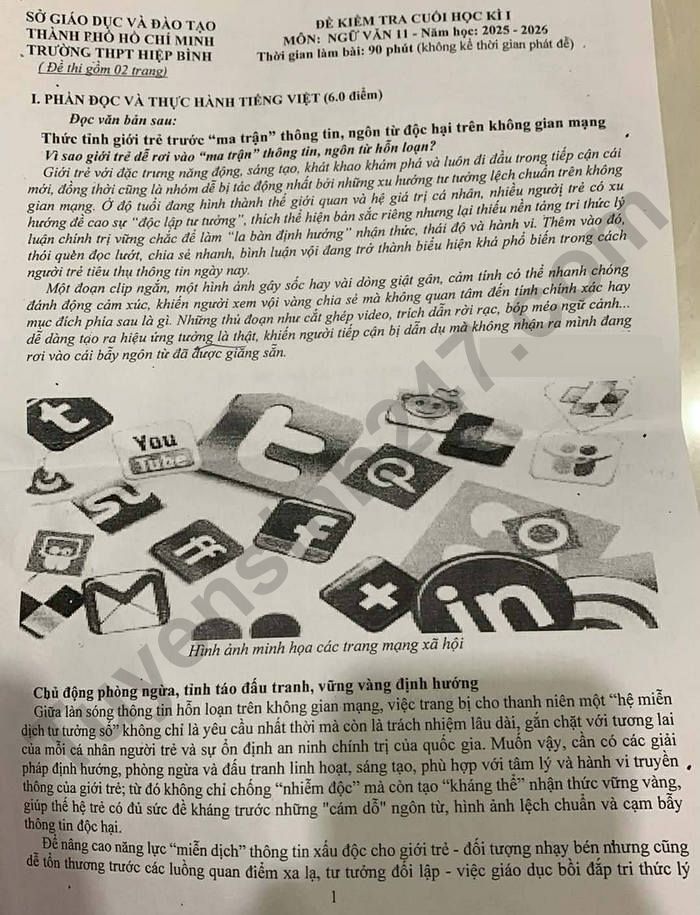 Đề thi học kì 1 năm 2025 THPT Hiệp Bình - Văn lớp 11