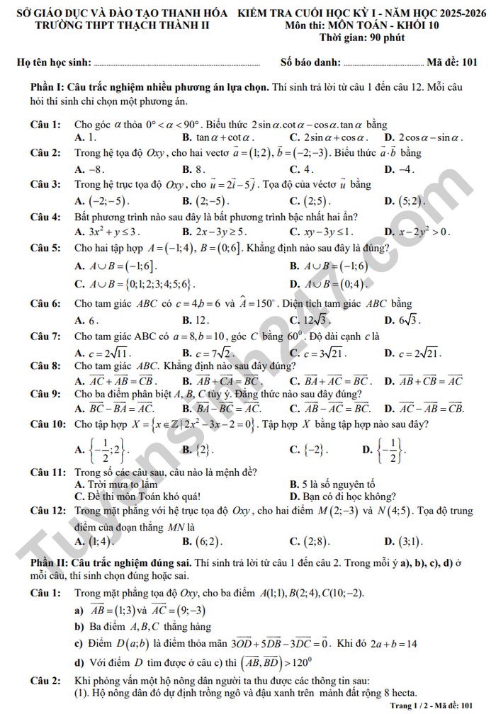 Đề thi học kì 1 Toán 10 THPT Thạch Thành 2 năm 2025