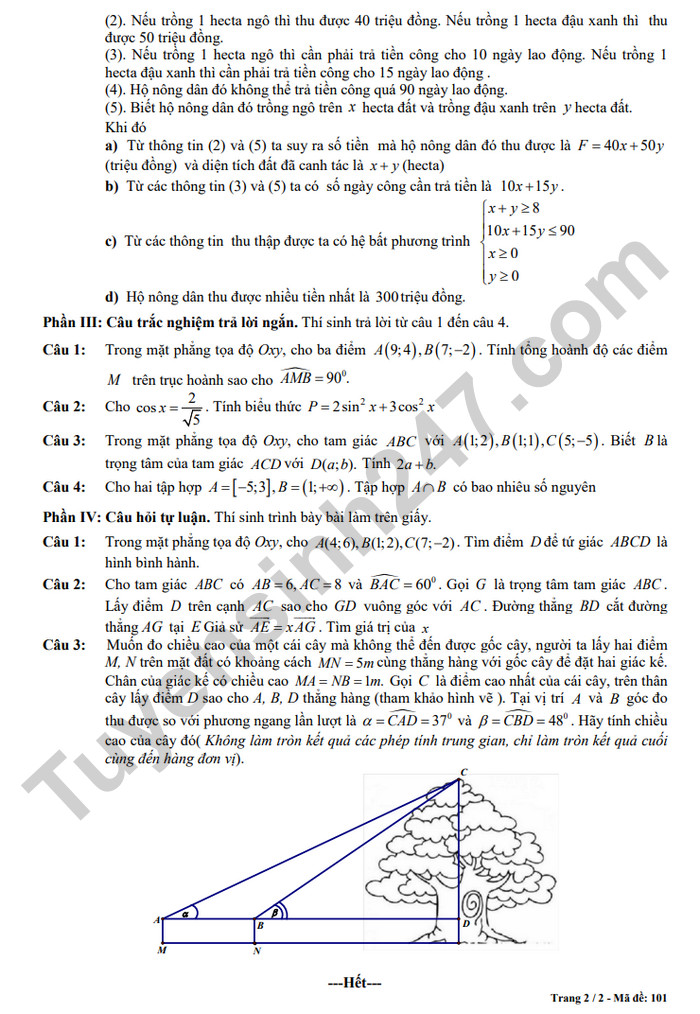 (2). Nếu trồng 1 hecta ngô thì thu được 40 triệu đồng. Nếu trồng 1 hecta đậu xanh thì thu được 50 triệu đồng.