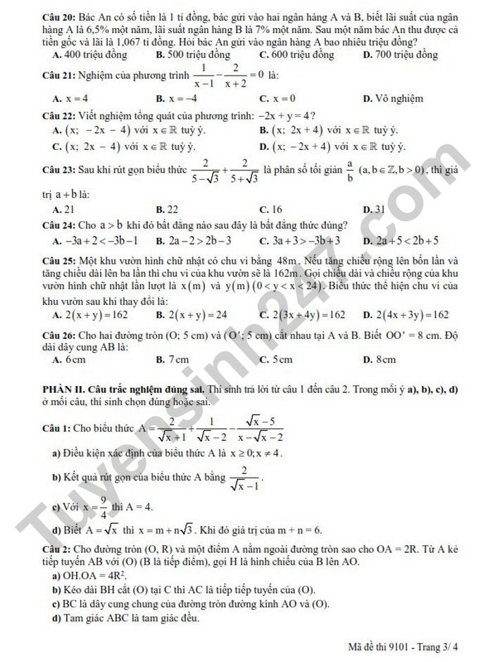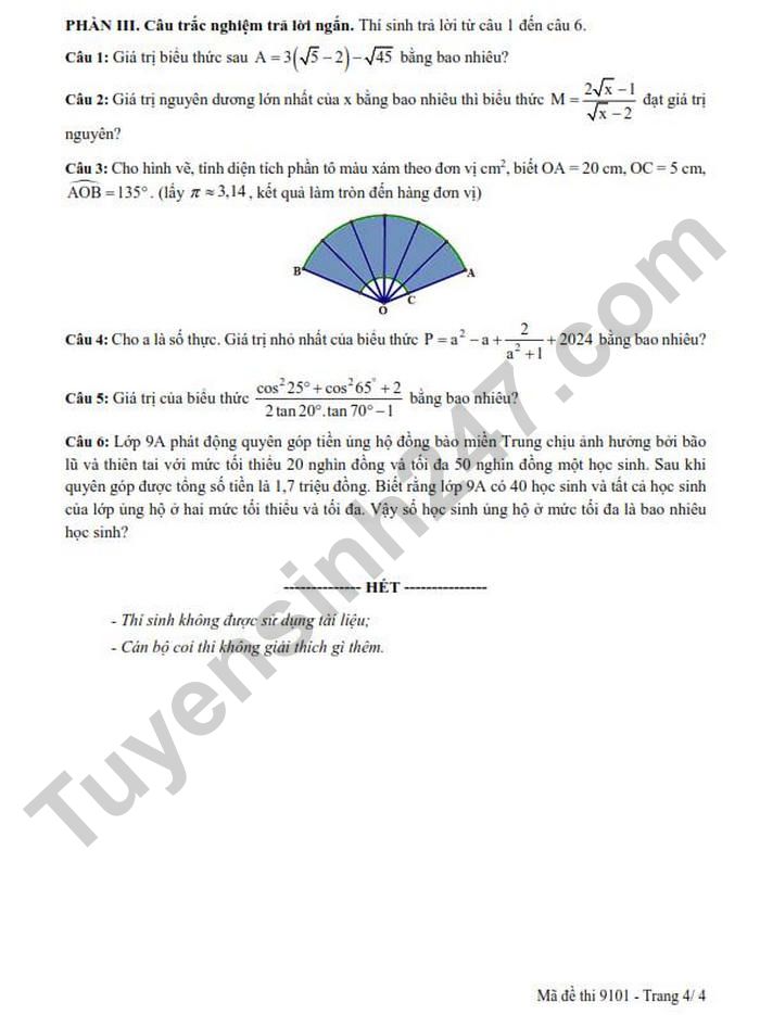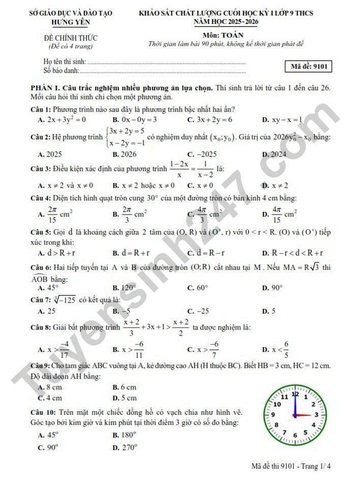 Đề thi học kì 1 Toán lớp 9 Sở GDĐT Hưng Yên 2025