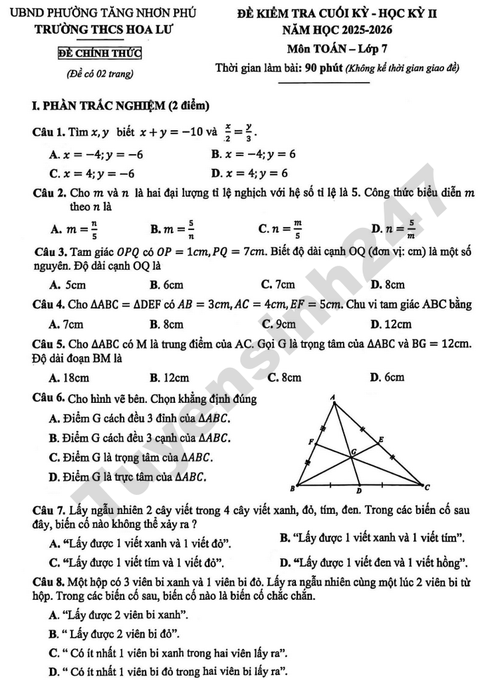 Đề thi học kì 2 lớp 7 môn Toán 2026 - THCS Hoa Lư