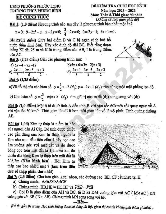Đề thi học kì 2 lớp 8 môn Toán 2026 - THCS Phước Bình