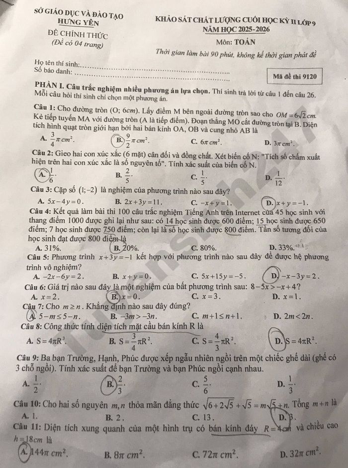 Đề thi học kì 2 lớp 9 môn Toán 2026 - Sở GD Hưng Yên