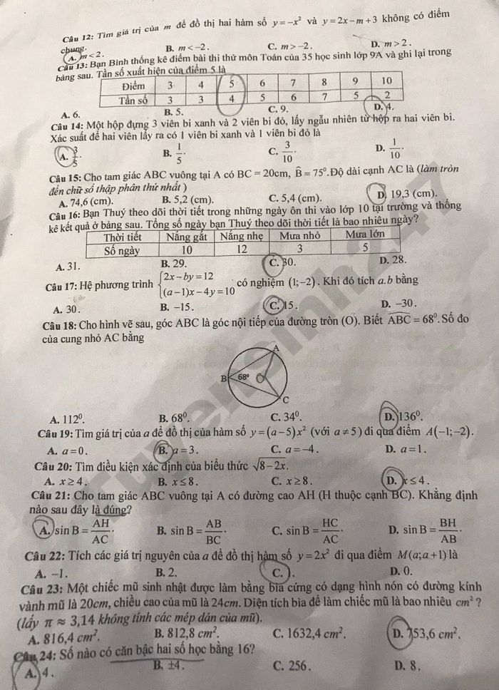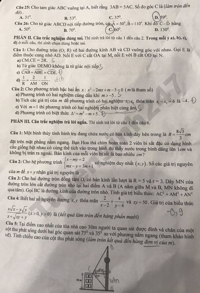 Lưu ý: Đáp án trong đề là bài làm của học sinh, có thể không chính xác