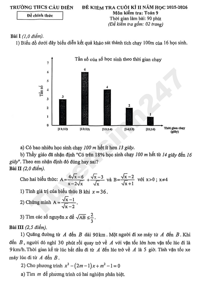 Đề thi học kì 2 lớp 9 môn Toán 2026 - THCS Cầu Diễn