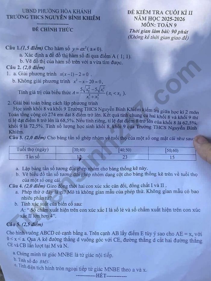 Đề thi học kì 2 lớp 9 môn Toán 2026 - THCS Nguyễn Bỉnh Khiêm