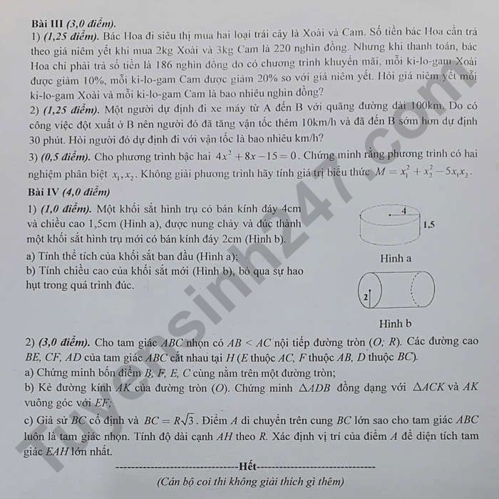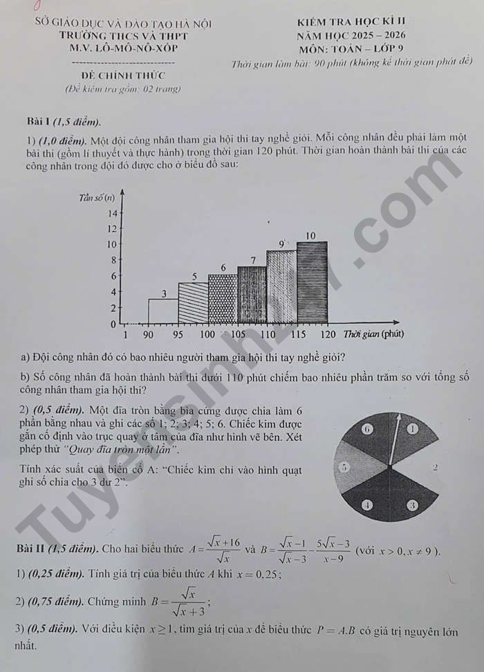 Đề thi học kì 2 lớp 9 môn Toán 2026 - THCS và THPT M.V. Lô-mô-nô-xốp