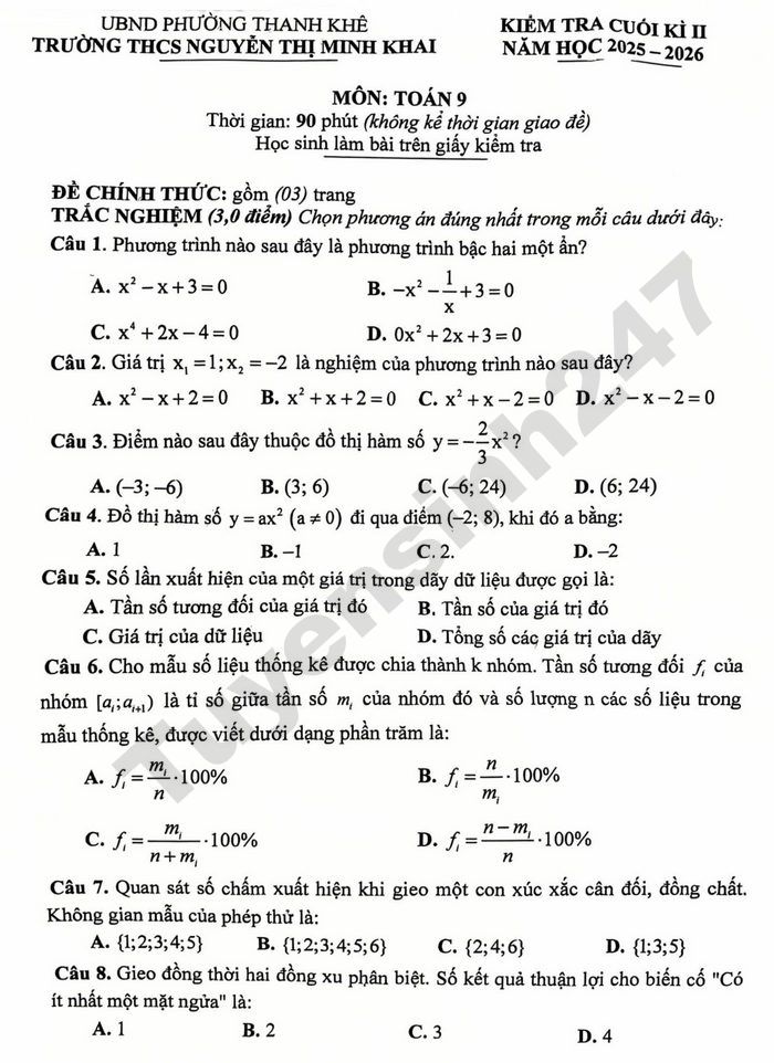 Đề thi học kì 2 lớp 9 môn Toán - THCS Nguyễn Thị Minh Khai 2026