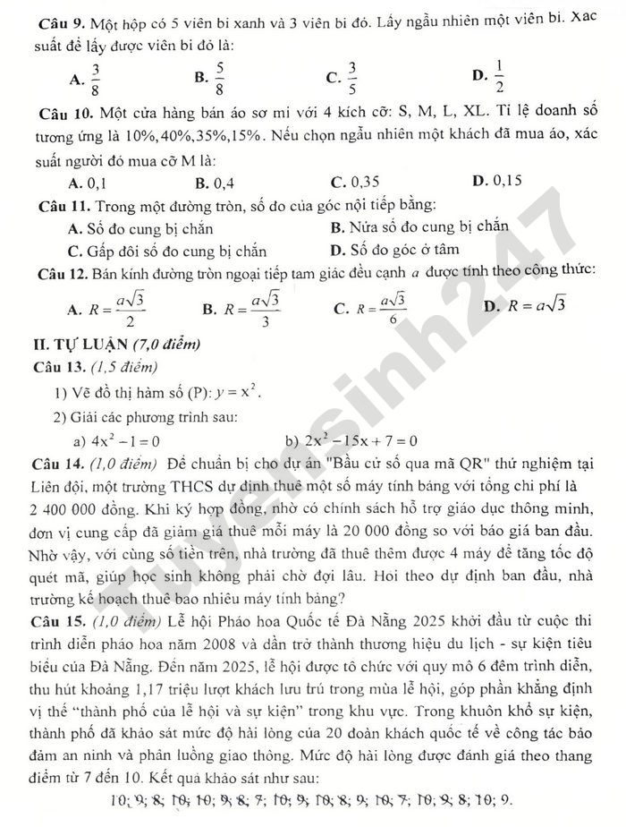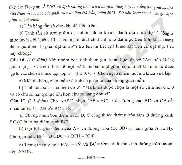 Câu 15. (1,0 điểm) Lễ hội Pháo hoa Quốc tế Đà Nẵng 2025 khởi đầu từ cuộc thi trình diễn pháo hoa năm 2008 và dần trở thành thương hiệu du lịch - sự kiện tiêu biểu của Đà Nẵng. Đến năm 2025, lễ hội được tổ chức với quy mô 6 đêm trình diễn, thu hút khoảng 1,17 triệu lượt khách lưu trú trong mùa lễ hội, góp phần khẳng định vị thế “thành phố của lễ hội và sự kiện” trong khu vực. Trong khuôn khổ sự kiện, thành phố đã khảo sát mức độ hài lòng của 20 đoàn khách quốc tế về công tác bảo đảm an ninh và phân luồng giao thông. Mức độ hài lòng được đánh giá theo thang điểm từ 7 đến 10. Kết quả khảo sát như sau:
