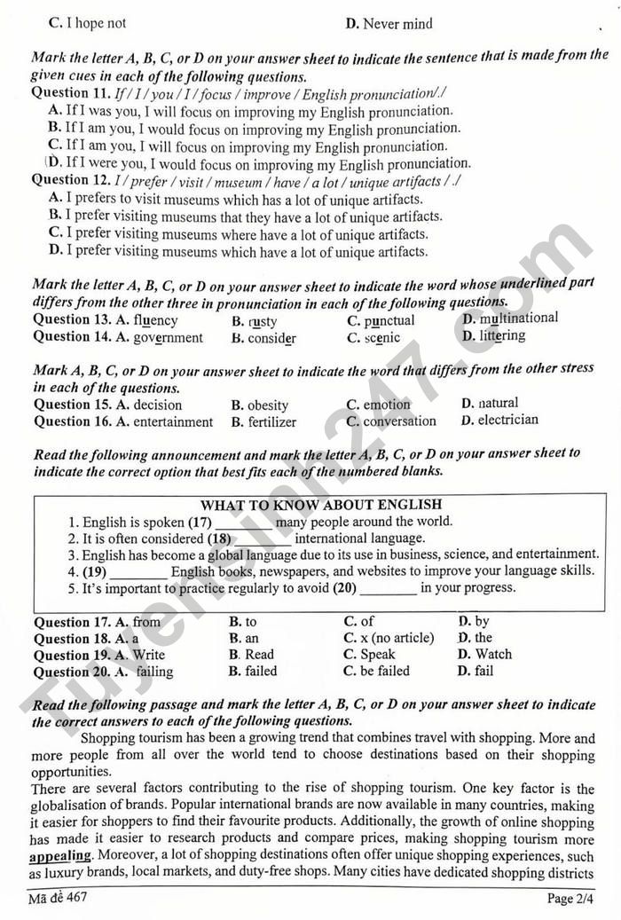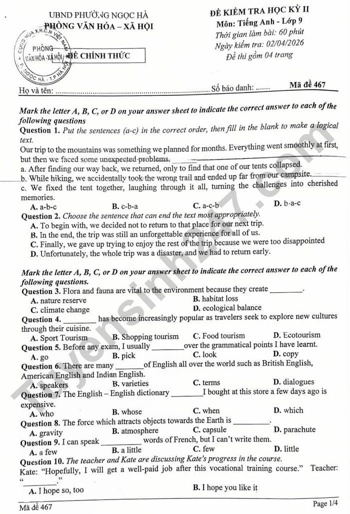 Đề thi học kì 2 môn Anh lớp 9 phường Ngọc Hà 2026