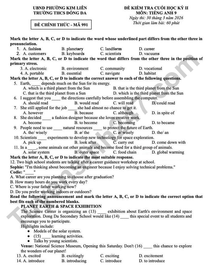 Đề thi học kì 2 môn Anh lớp 9 THCS Đống Đa 2026