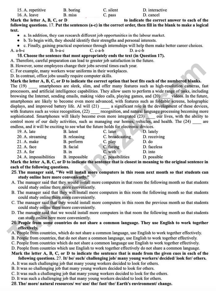 Mark the letter A, B, C, or D to indicate the sentence that is closest in meaning to the original sentence in each of the following questions.