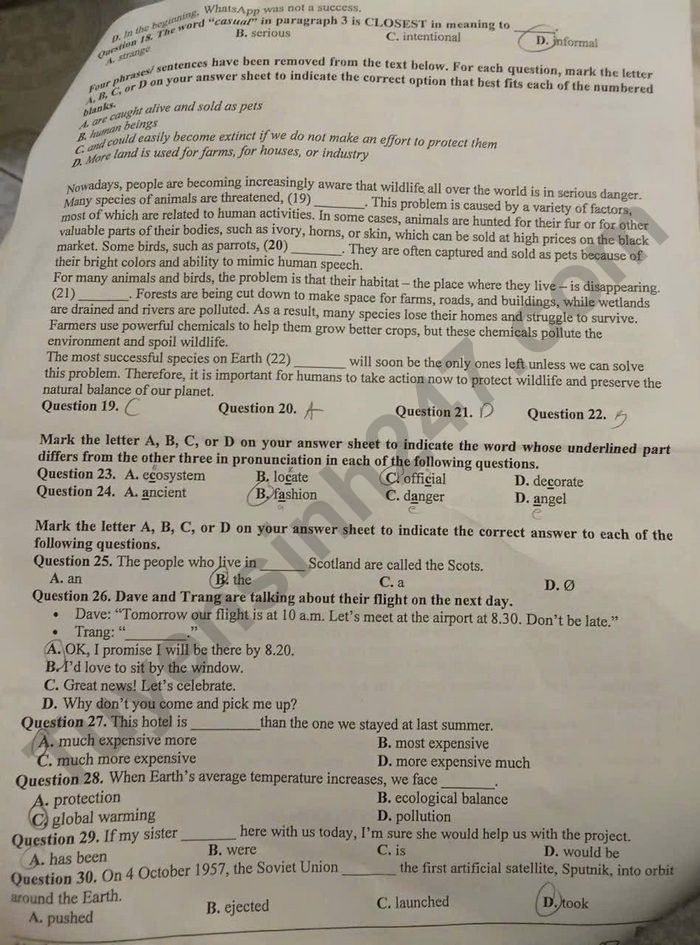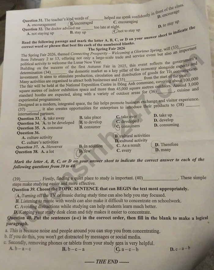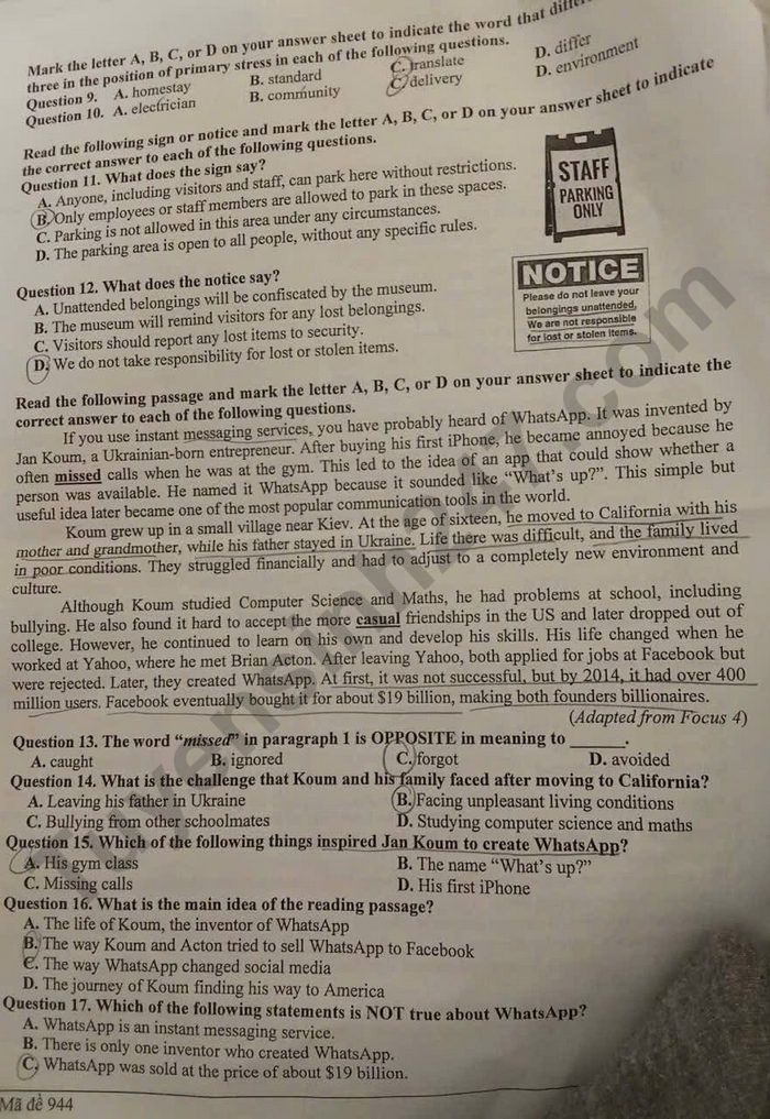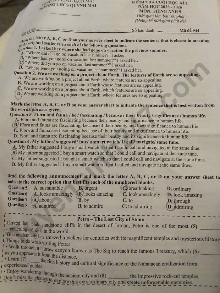 Lưu ý: Đáp án trong đề là bài làm của học sinh, có thể không chính xác
