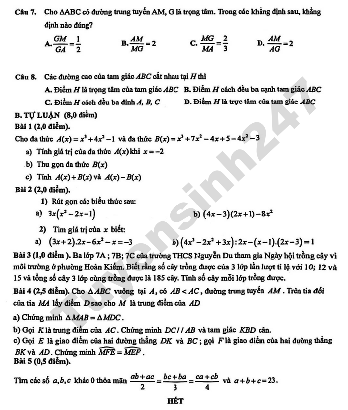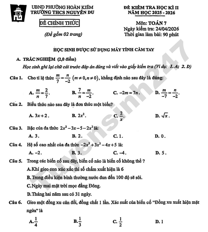 Đề thi học kì 2 năm 2026 lớp 7 môn Toán - THCS Nguyễn Du