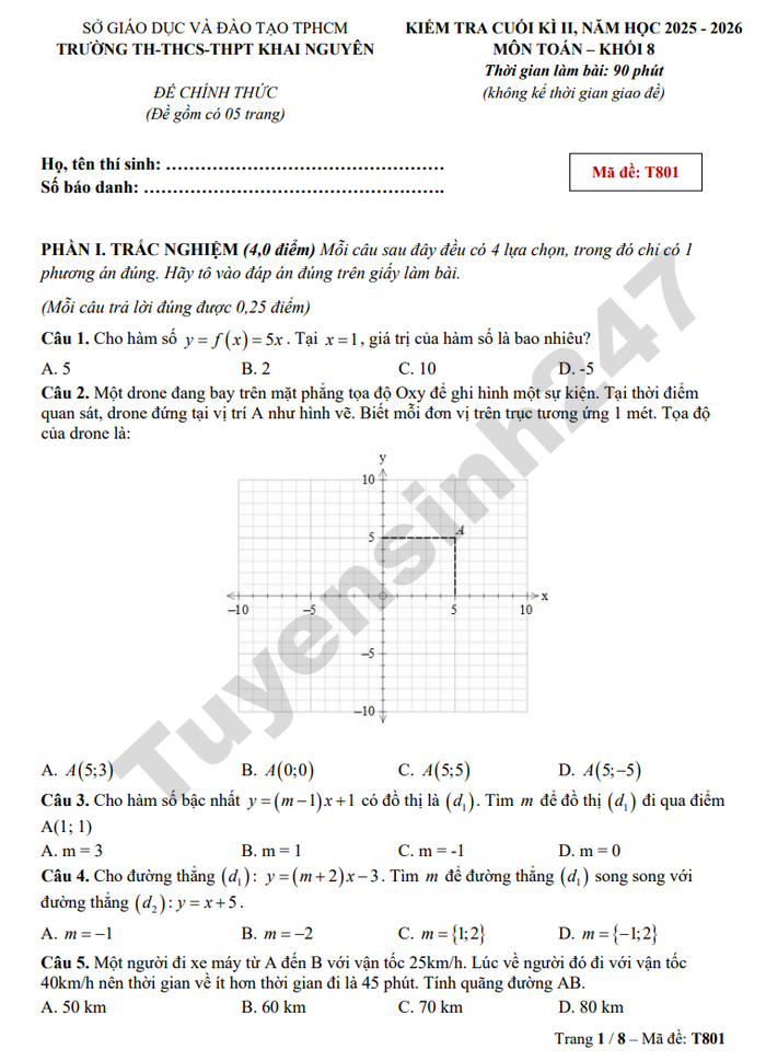 Đề thi học kì 2 năm 2026 lớp 8 môn Toán - TH-THCS-THPT Khai Nguyên (Có đáp án)