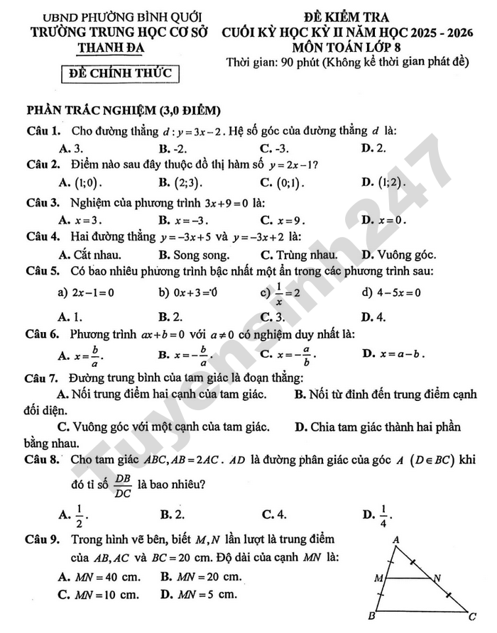 Đề thi học kì 2 năm 2026 THCS Thanh Đa - Toán lớp 8