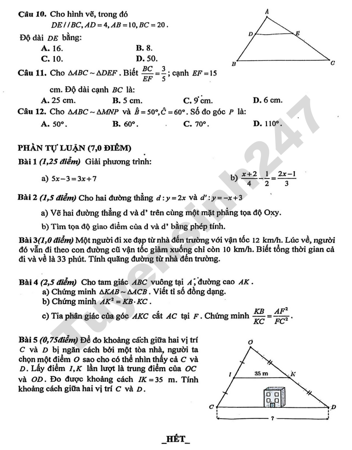 Bài 5 (0,75điểm) Để đo khoảng cách giữa hai vị trí C và D bị ngăn cách bởi một tòa nhà, người ta chọn một điểm O sao cho có thể nhìn thấy cả C và D. Lấy điểm I,K lần lượt là trung điểm của OC và OD. Đo được khoảng cách IK = 35 m. Tính khoảng cách giữa hai vị trí C và D.