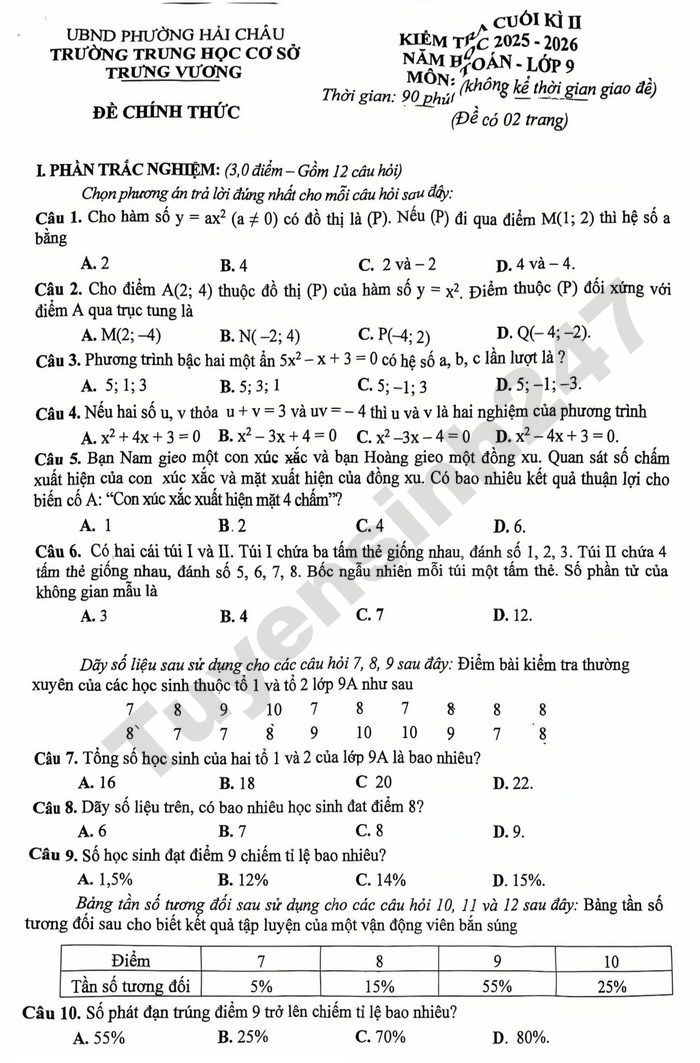 Đề thi học kì 2 năm 2026 THCS Trưng Vương - Đà Nẵng lớp 9 môn Toán