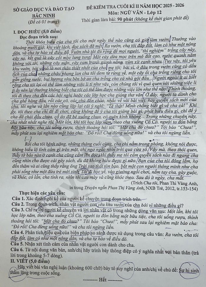 Đề thi học kì 2 năm 2026 Văn lớp 12 Sở GD Bắc Ninh