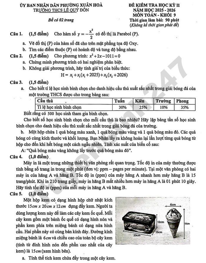 Đề thi học kì 2 Toán lớp 9 THCS Lê Quý Đôn năm 2026