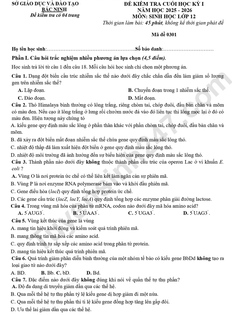 Đề thi kì 1 lớp 12 môn Sinh 2025 - Sở GD Bắc Ninh