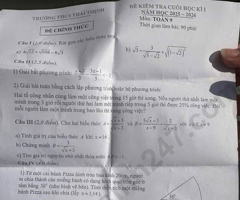 Đề thi kì 1 lớp 9 môn Toán 2025 -THCS Thái Thịnh