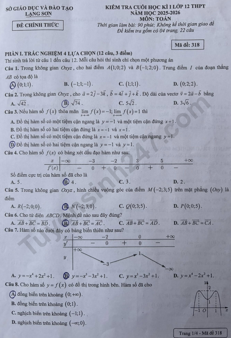 Đề thi kì 1 môn Toán lớp 12 - Sở GD Lạng Sơn 2025