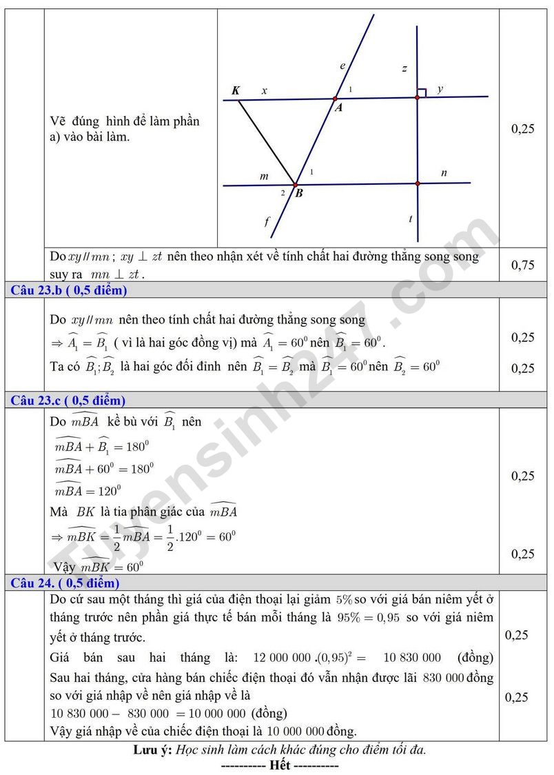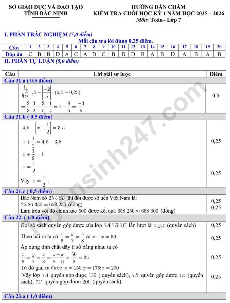 Đáp án Đề thi kì 1 lớp 7 môn Toán 2025 - Sở GD Bắc Ninh