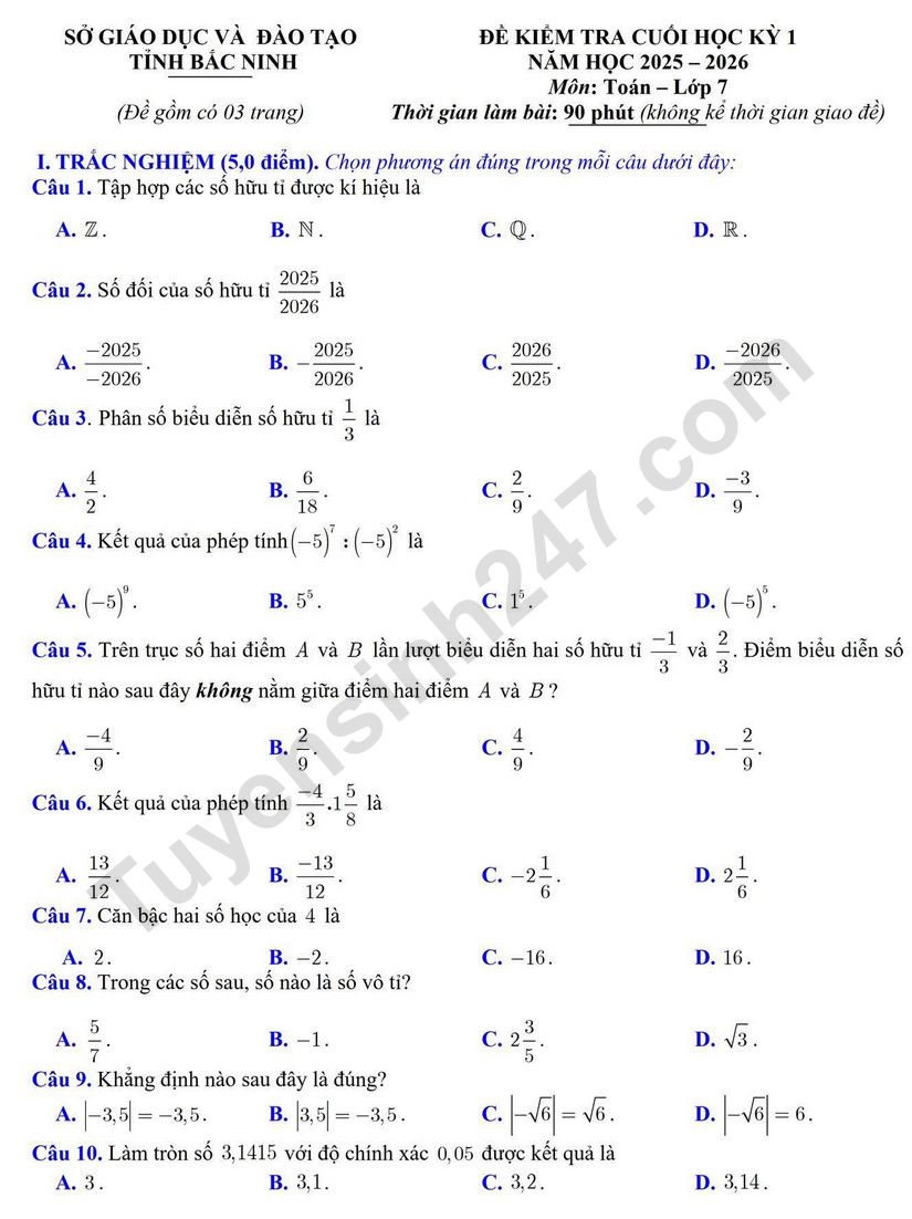 Đề thi kì 1 môn Toán lớp 7 - Sở GD Bắc Ninh 2025