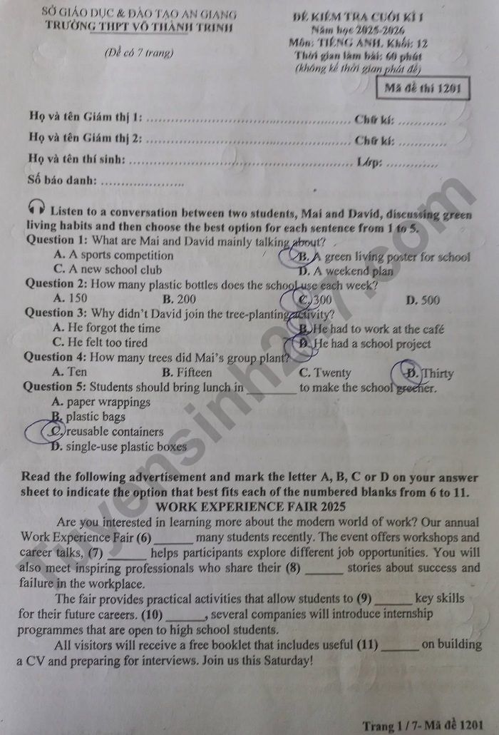 Đề thi kì 1 năm 2025 môn Anh 12 THPT Võ Thành Trinh